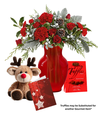 - Includes Greeting Card, Truffles, Reindeer & Vase: Comes with a full-size Christmas card for your heartfelt holiday wishes, decadent belgian truffles, a reindeer plush & a vase