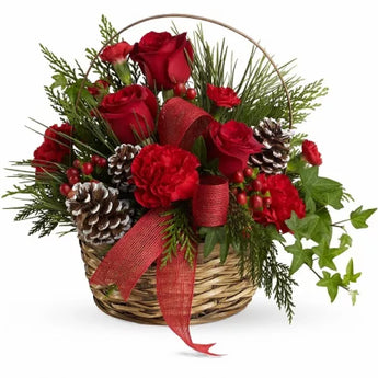 Contents include 3 red roses, 3 red carnations, 1 mini carnation, assorted greens, decorative ribbons and beautiful basket with special floral foam to keep flowers fresh for at least a week. Arrangement measures approximately 11"H by 10"L.