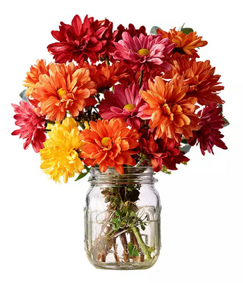 Celebrate the beauty of autumn with Fall Daisies in Mason Jar. This charming bouquet features vibrant daisies in rich fall hues; golden yellow, burnt orange, deep red, and warm burgundy, all the fall favourites arranged in a rustic mason jar.